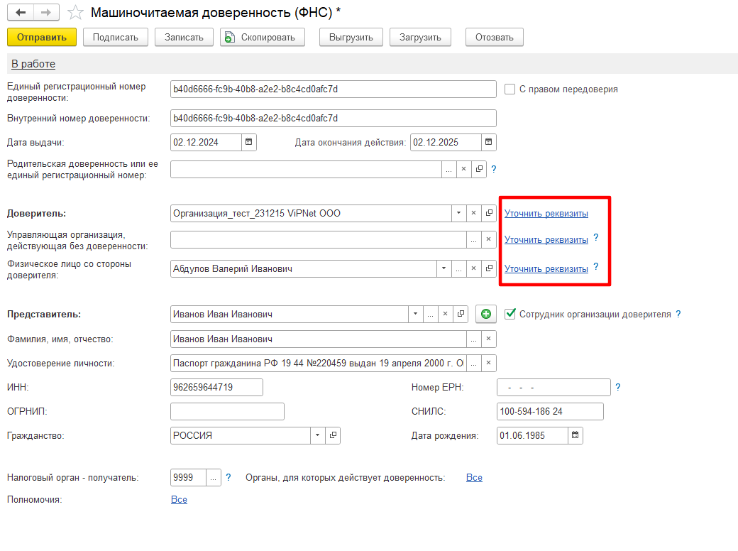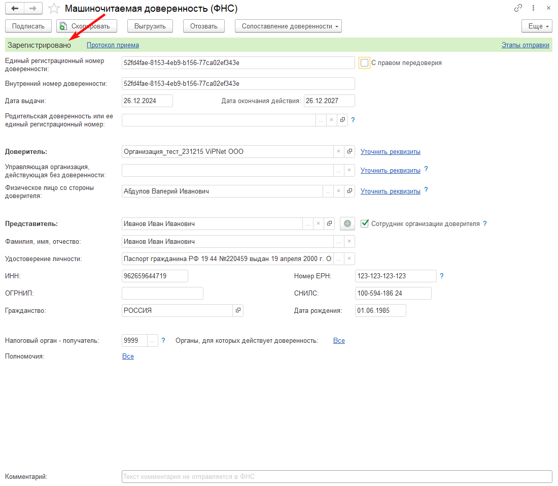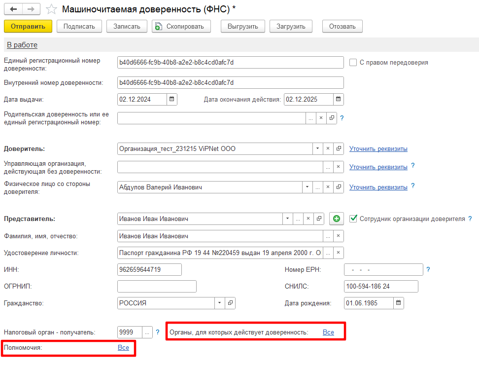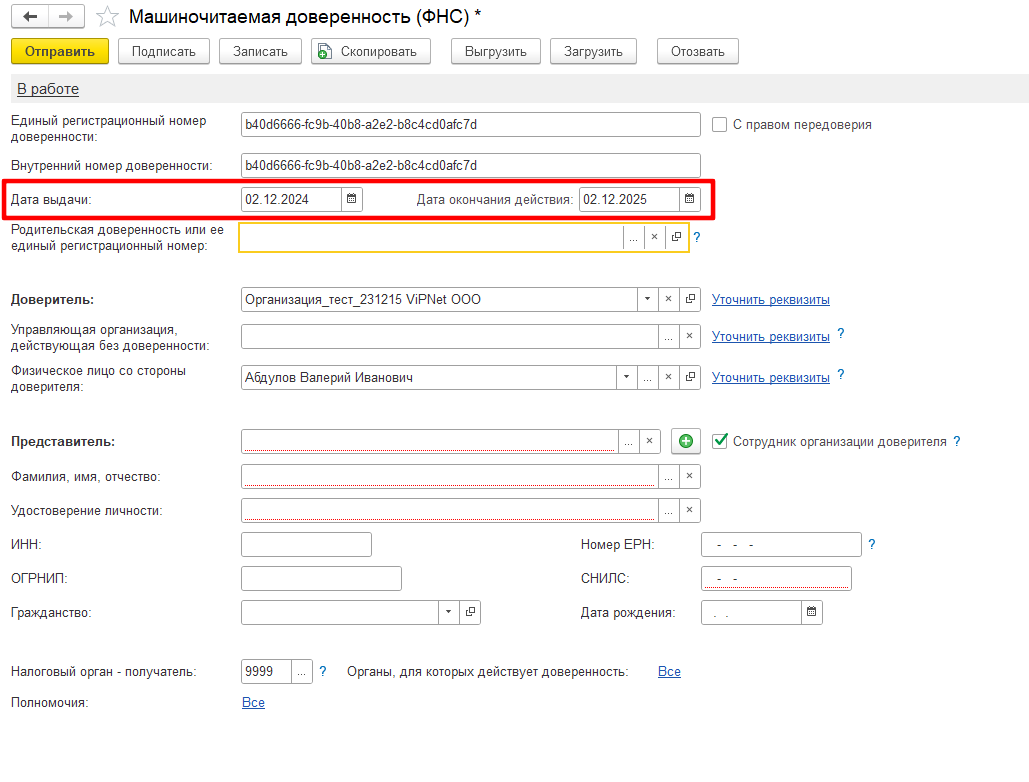 Руководитель юридического лица или ИП, являющийся доверителем, при наличии сертификата электронной подписи, может подписать и отправить доверенность на представителя организации напрямую из программы 1С по тому же каналу, который используется для отправки отчетности и других документов.