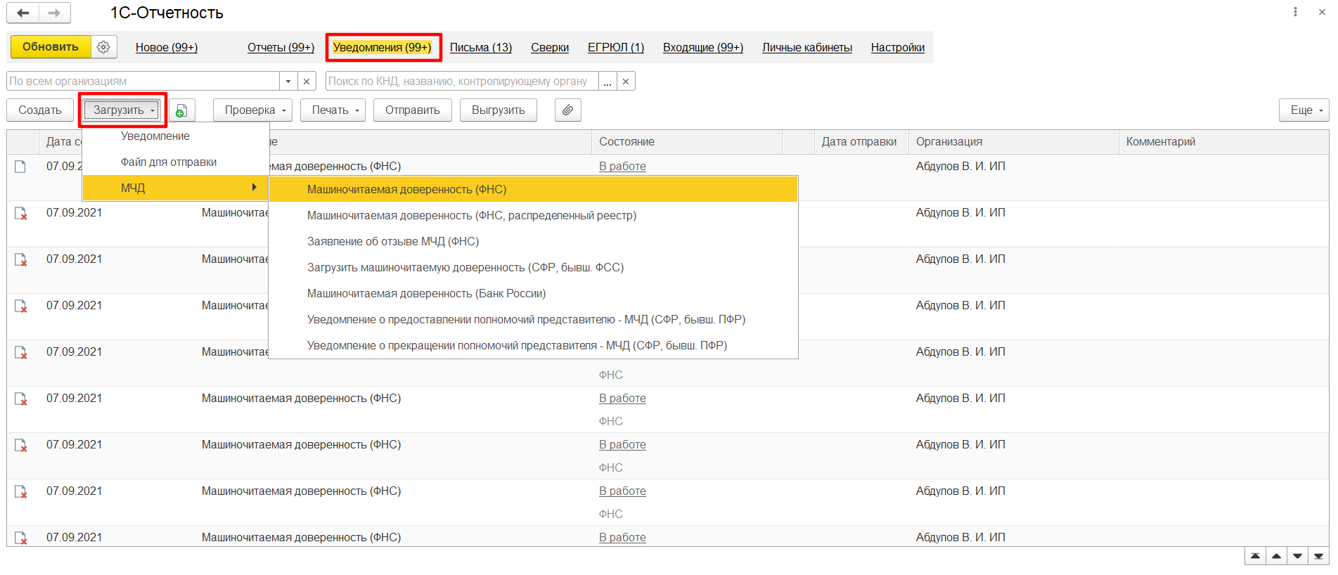 Доверенность, подготовленную в сторонней программе, можно загрузить из файла для отправки на регистрацию в ФНС. Для этого на закладке Уведомления нажмите кнопку Загрузить и выберите Машиночитаемая доверенность (ФНС) (рис.1).