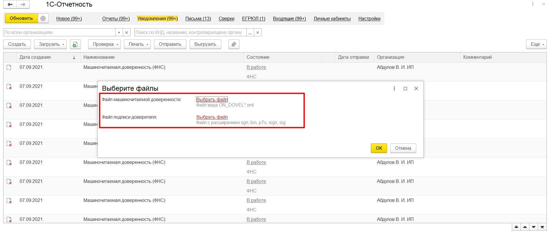 Если при загрузке выбрать только файл машиночитаемой доверенности, то файл подписи доверителя будет сформирован автоматически при отправке доверенности. В этом случае доверитель должен быть пользователем 1С-Отчетности, т.к. подписание будет производиться сертификатом электронной подписи пользователя 1С-Отчетности.