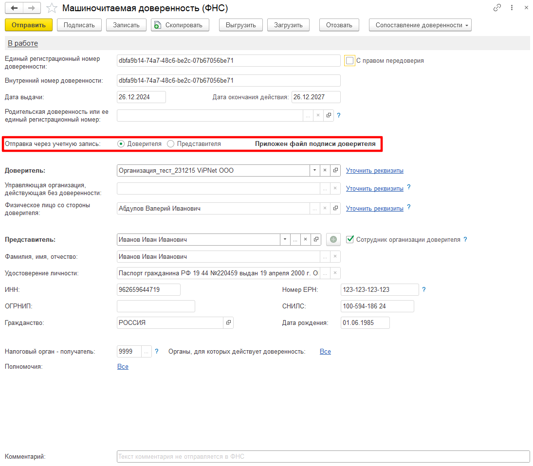 При загрузке доверенности с файлом подписи редактирование полей будет недоступно. При этом можно будет выбрать вариант отправки доверенности через учетную запись доверителя или представителя, а также выбрать другого доверителя или представителя. Эти изменения повлияют только на учетную запись, через которую отправляется доверенность, и не отразятся на сведениях, указанных в доверенности. (рис.3).
