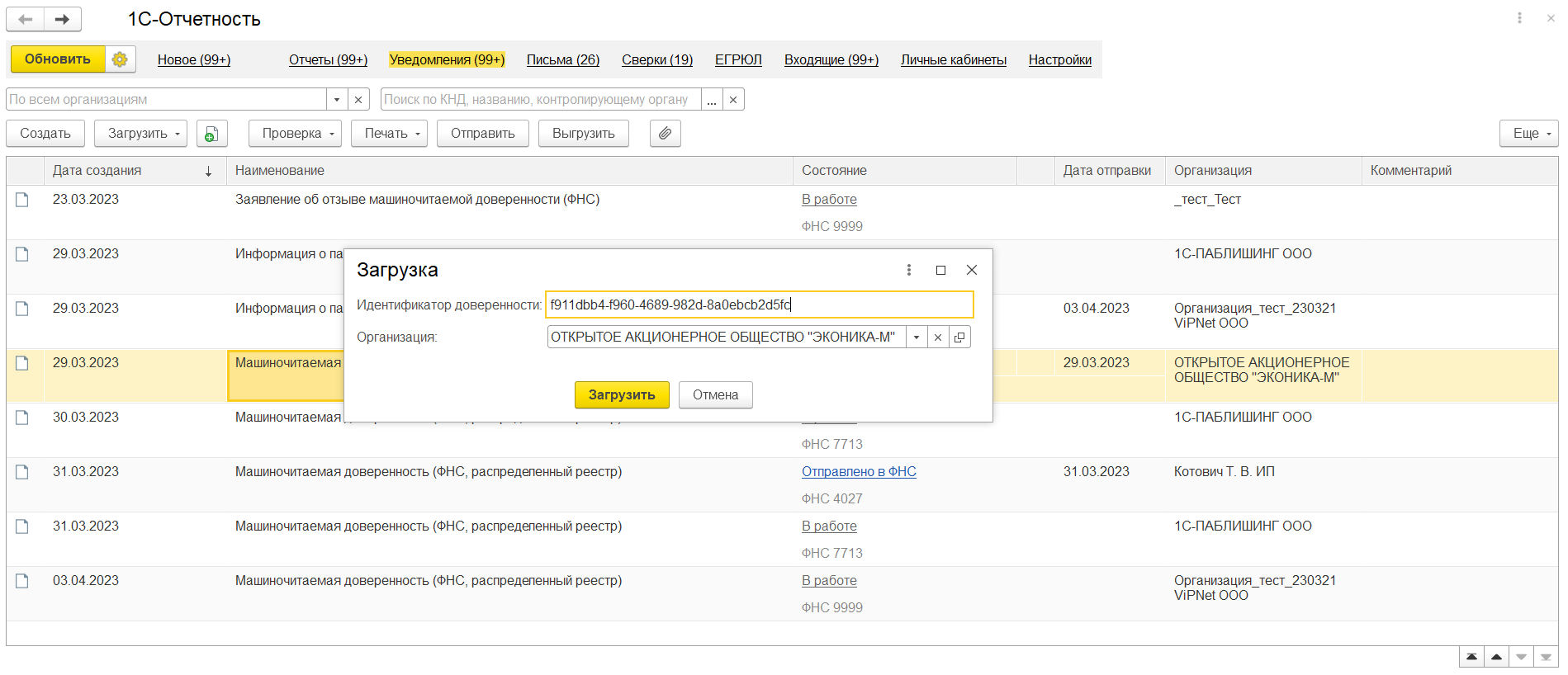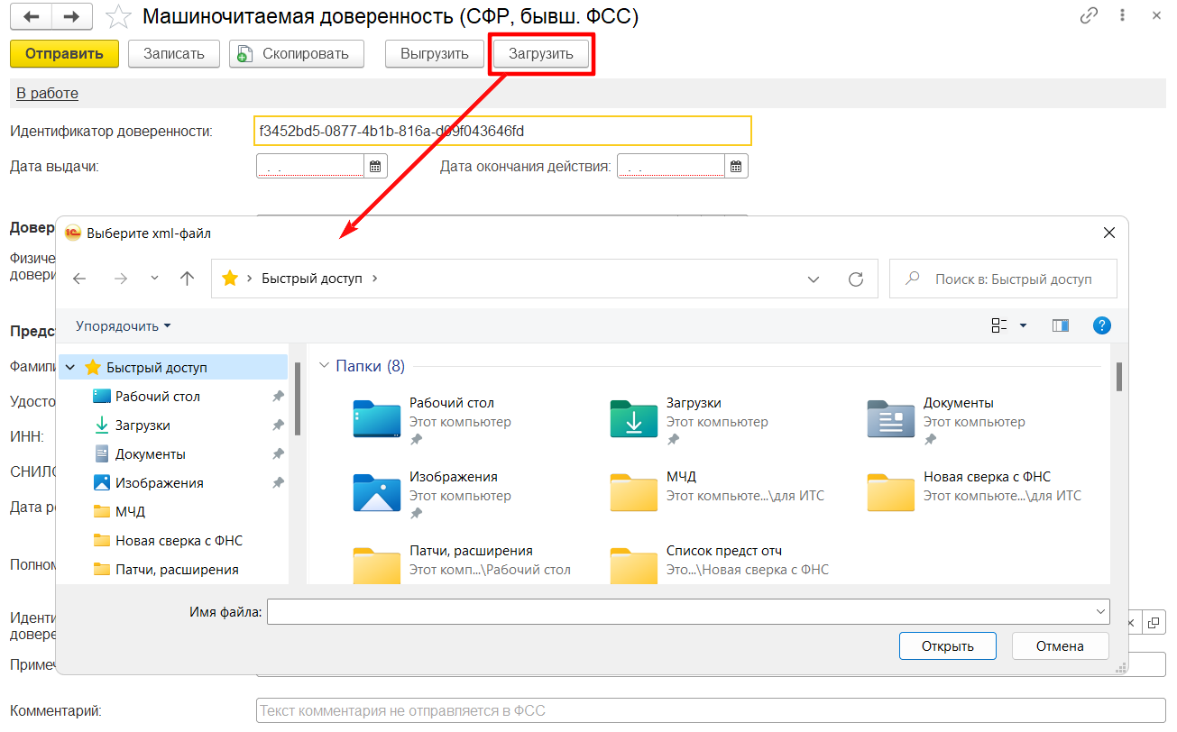 Для загрузки xml-файла доверенности создайте доверенность по кнопке Создать на закладке Уведомления. В открывшейся форме доверенности нажмите кнопку Загрузить (рис. 11) и выберите файл доверенности.