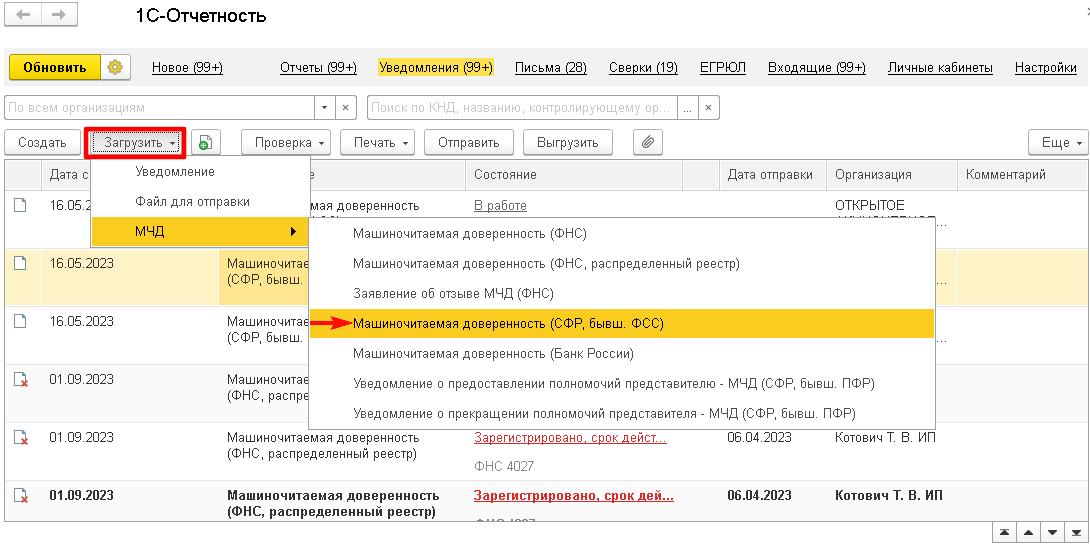 Для загрузки по идентификатору доверенности с сервера СФР скопируйте идентификатор доверенности из той программы, где она была зарегистрирована. Далее на закладке Уведомления нажмите кнопку Загрузить и выберите Машиночитаемая доверенность (СФР, бывш. ФСС) (рис. 9).
