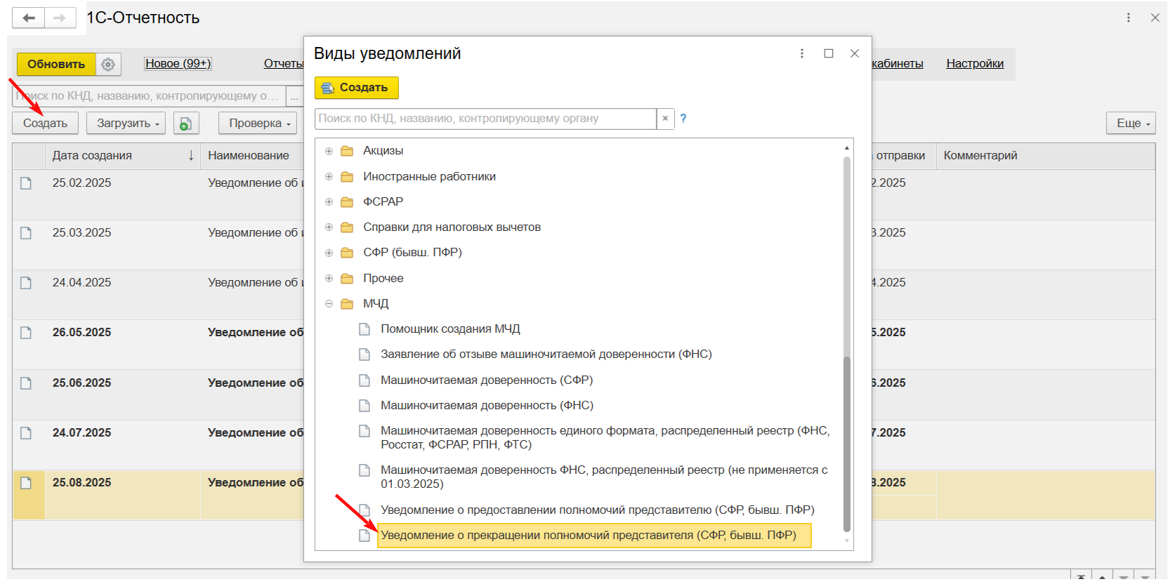 При необходимости, например, при увольнении сотрудника, МЧД, зарегистрированную в СФР, можно отозвать. Для этого нажмите кнопку Создать в разделе Уведомления сервиса 1С-Отчетность и выберите Уведомление о прекращении полномочий представителя (СФР, бывш. ПФР) (рис. 5).