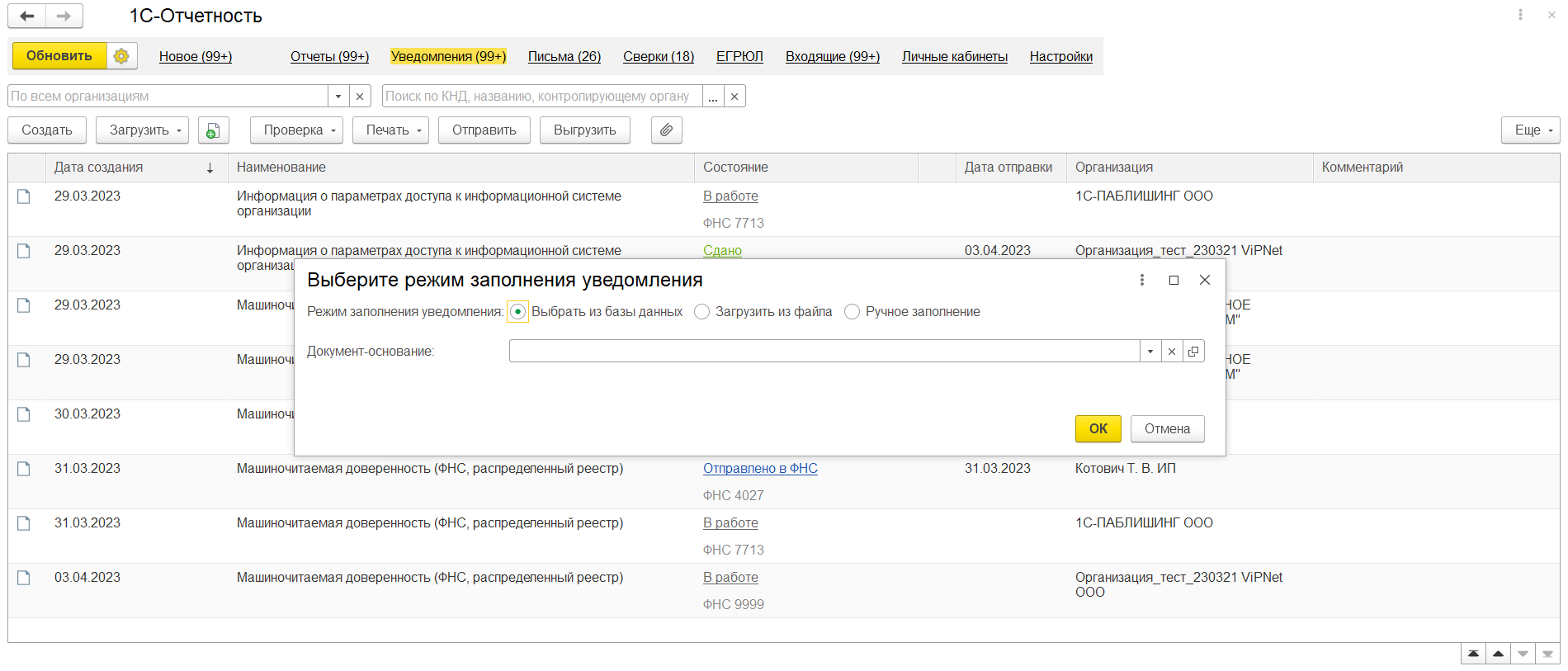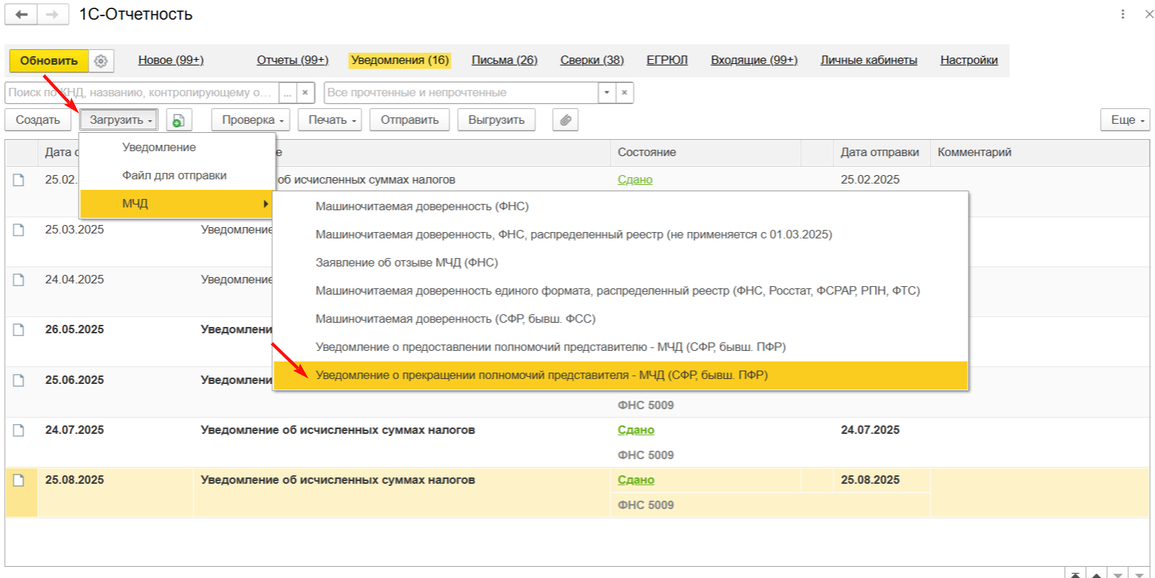Также отозвать доверенность можно загрузив xml-файл УПРУП. Для этого на закладке Уведомления, нажмите кнопку Загрузить и выберите Уведомление о прекращении полномочий представителя - МЧД (СФР, бывш. ПФР) (рис. 7).
