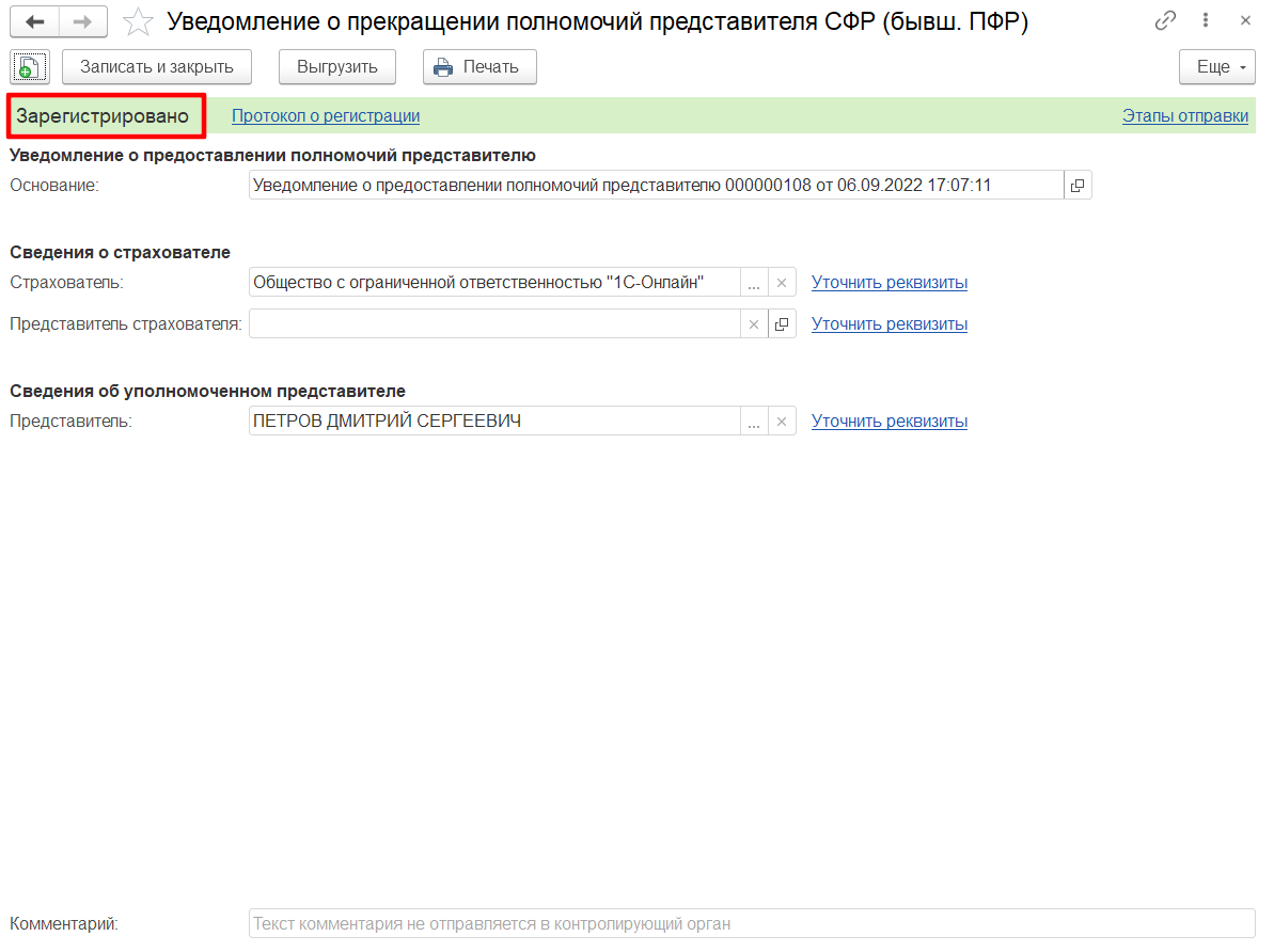 В открывшейся форме выберите xml-файл УПРУП. После загрузки УПРУП откроется со статусом В работе, далее его необходимо отправить на регистрацию в СФР.