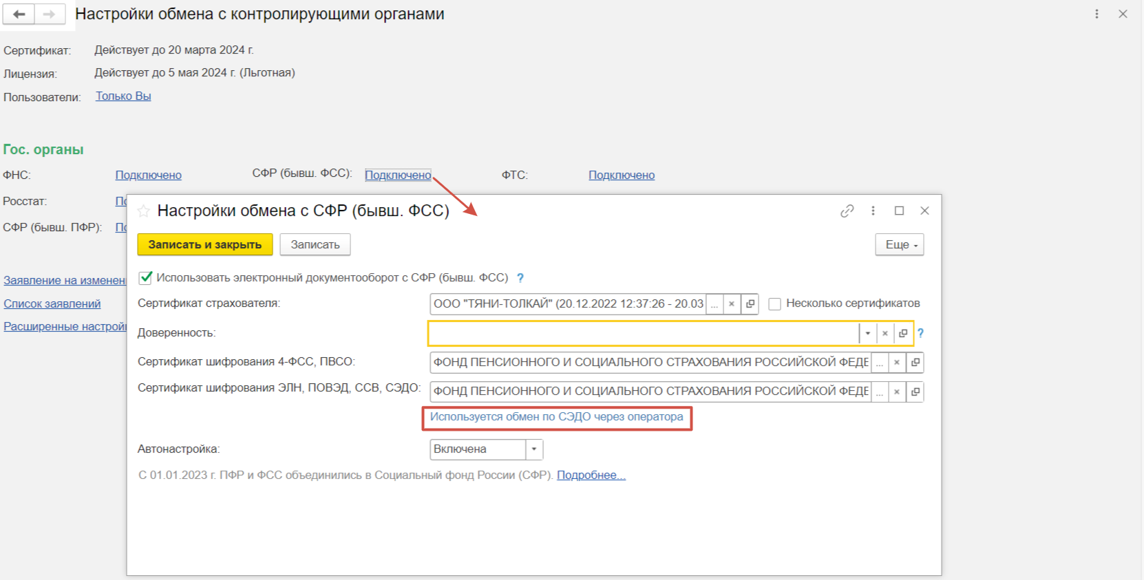 Обмен с СЭДО СФР через оператора подключается автоматически для тех пользователей, у которых подключена 1С-Отчетность с направлением СФР (бывш. ФСС) и при этом лицензия и сертификат 1С-Отчетности действительны.