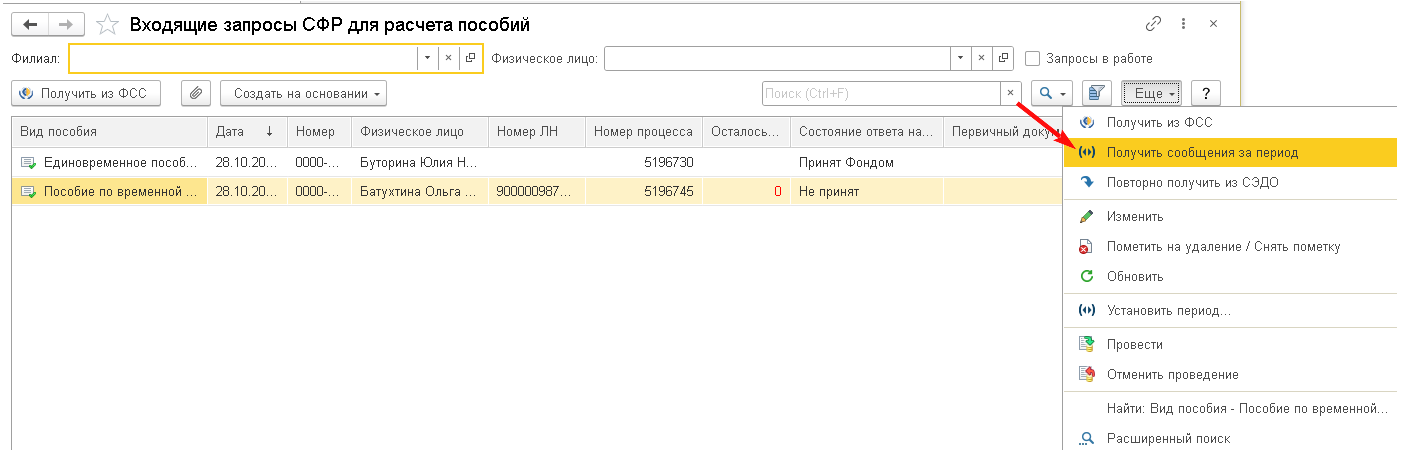 Такая ситуация возможна в исключительных случаях, например, если сообщение было добавлено СФР задним числом и для обмена с СФР используется 2 программы, при этом сообщение было скачано в одной из программ. Вы можете запросить сообщения за период, используя команду «Получить сообщения за период». Для этого из меню «Еще» списка документов «Входящие запросы СФР для расчета пособий» запустите команду «Получить сообщения за период» (рис.1).