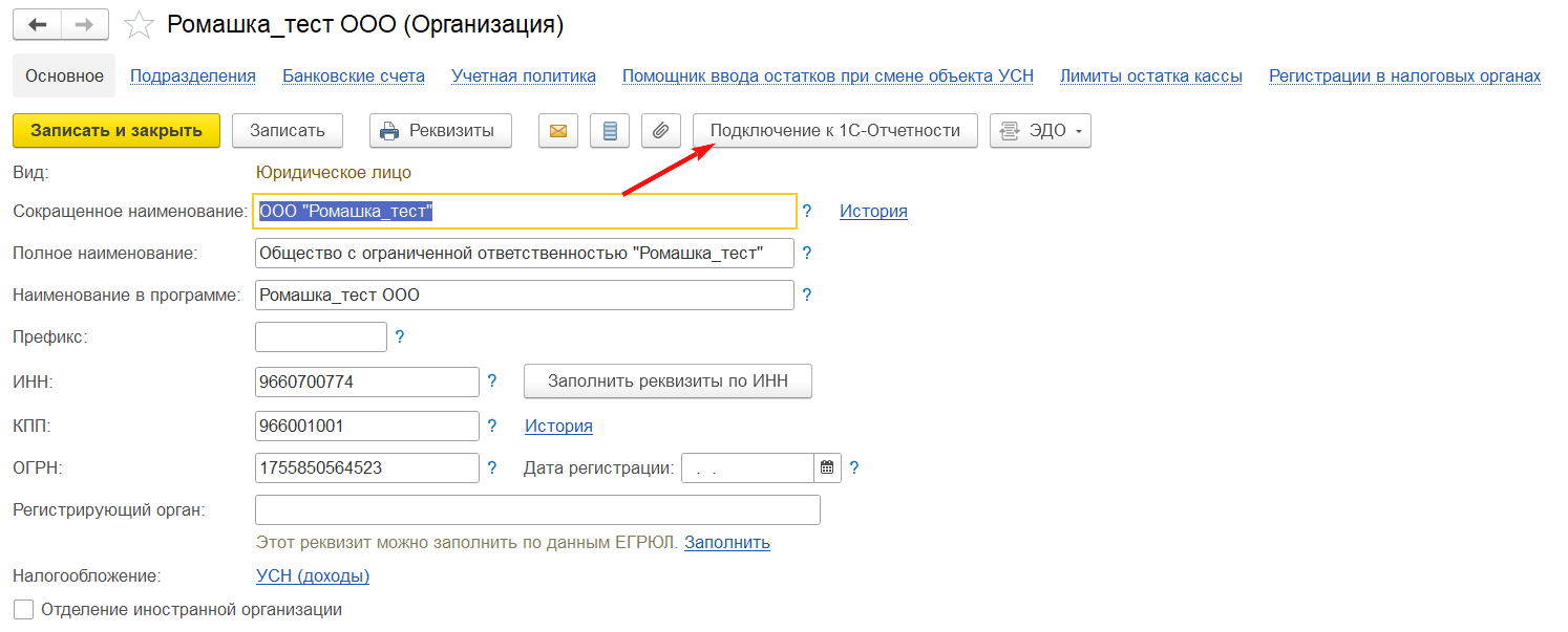 Для вызова специального помощника нажмите кнопку "Подключение к 1С-Отчетности" в форме элемента справочника "Организации" (рис. 1).