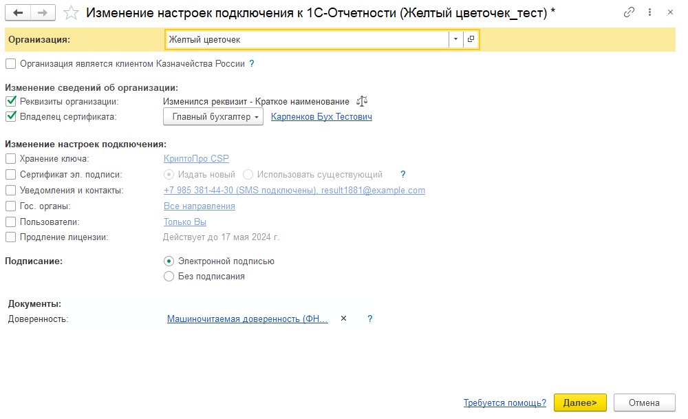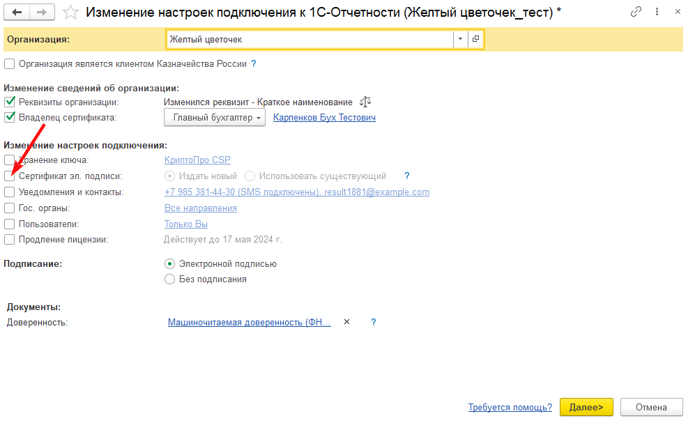 Все вышеуказанные пункты переиздания сертификата отслеживаются программой автоматически и с помощью установки соответствующих флажков рекомендуются к изменению в форме помощника "Изменение настроек подключения к 1С-Отчетности".