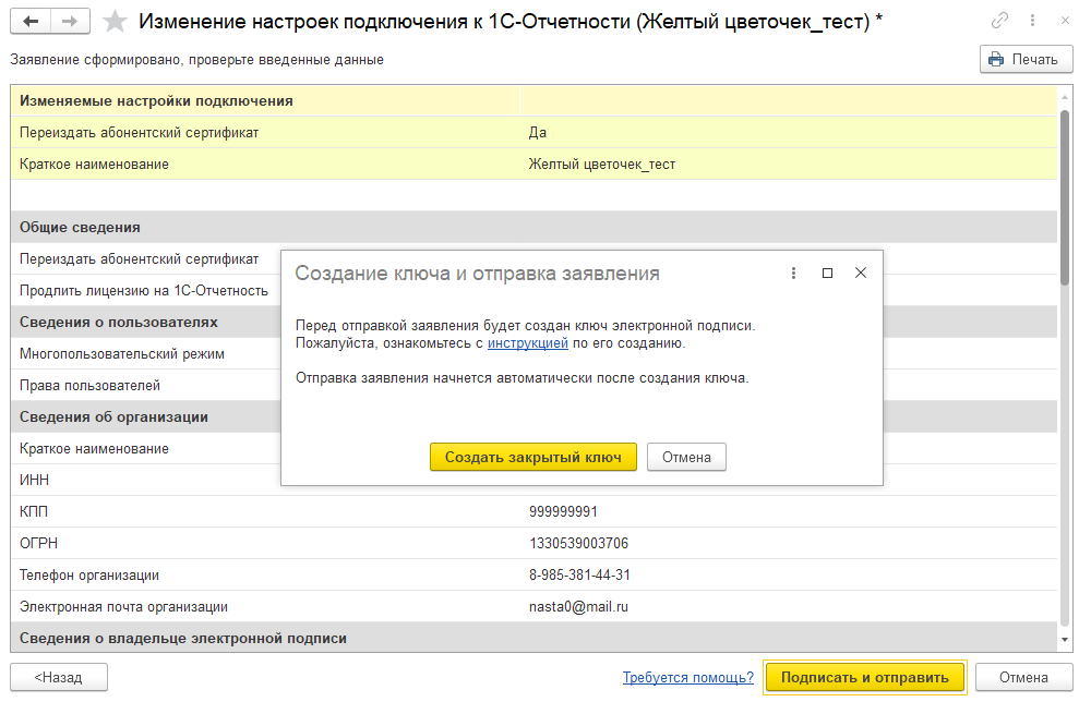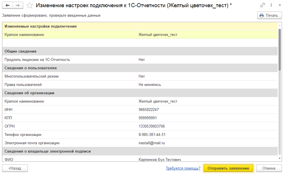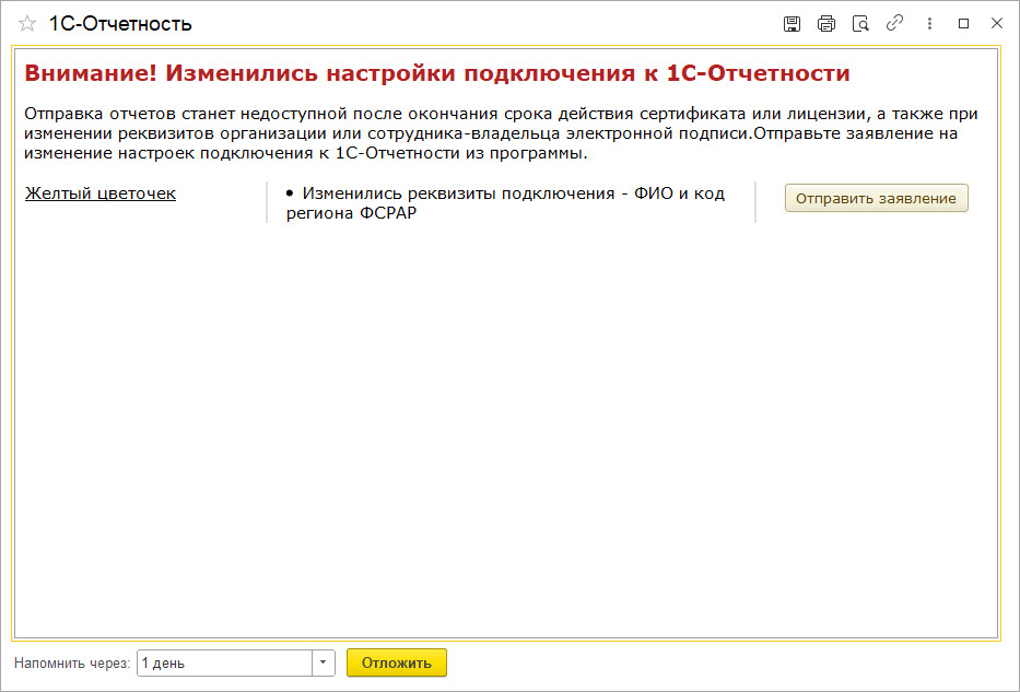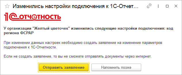 Кроме того, при изменении в программе ключевых реквизитов организации, указанных при подключении к 1С-Отчетности, или сведений о физическом лице – владельце абонентского сертификата, программа предлагает незамедлительно отправить соответствующее заявление на изменение параметров подключения (рис. 4).