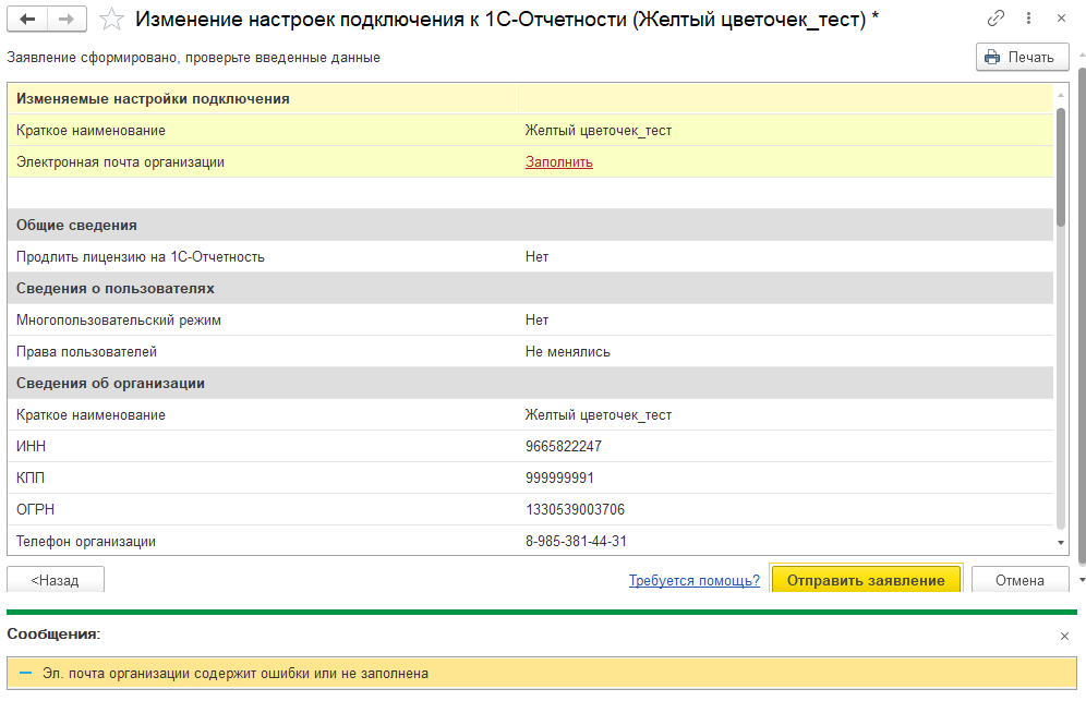 - Изменение реквизитов подключения к 1С-Отчетности (например: изменение адреса, ИНН, телефона организации и пр., которые были указаны при первичном подключении).
