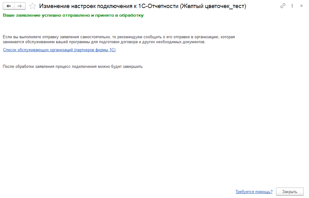 Чтобы завершить изменение настроек подключения к 1С-Отчетности, необходимо дождаться одобрения заявления.