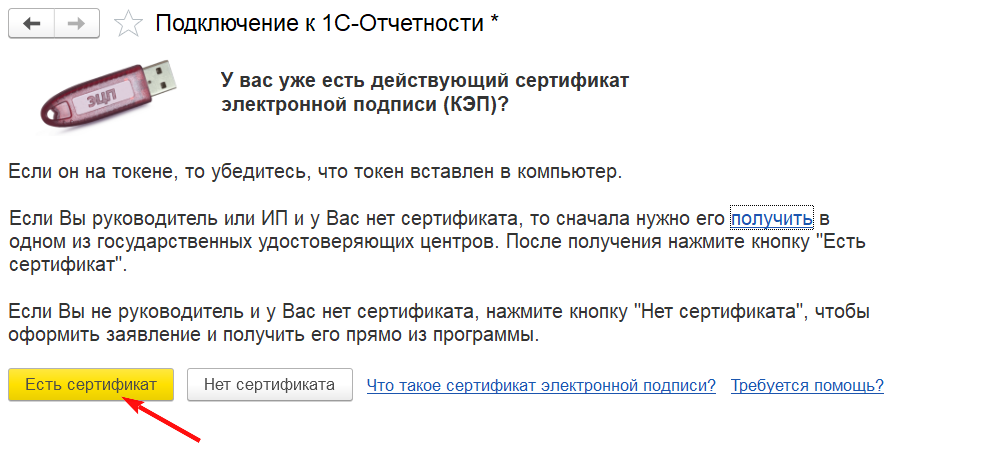 Если Вы руководитель или ИП и у Вас еще нет сертификата электронной подписи, то сначала его нужно получить в одном из государственных удостоверяющих центров. Подробнее о получении см. в статье Получение электронной подписи руководителя и ИП. После получения сертификата для подключения 1С-Отчетности нажмите кнопку Есть сертификат (рис.5).