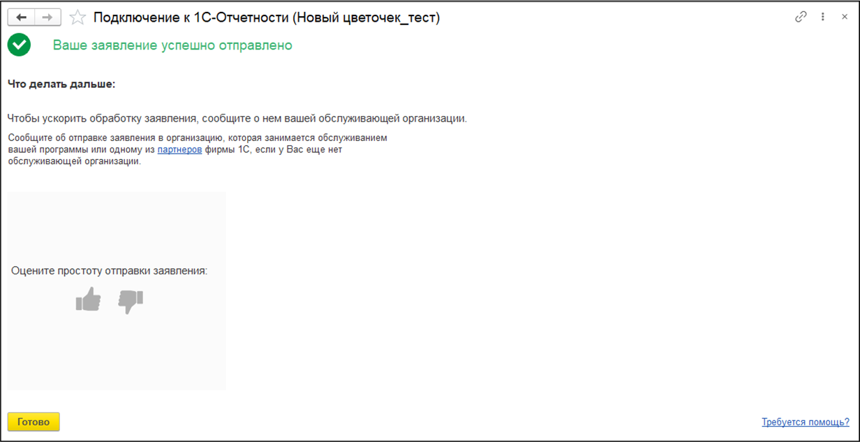 Когда заявление на подключение будет успешно отправлено, появится окно с сообщением как показано на рис. 13. В сообщении будет добавлен пункт 2 о необходимости предоставить доверенность или МЧД в ИФНС и указать ее в справочнике регистраций в налоговом органе.