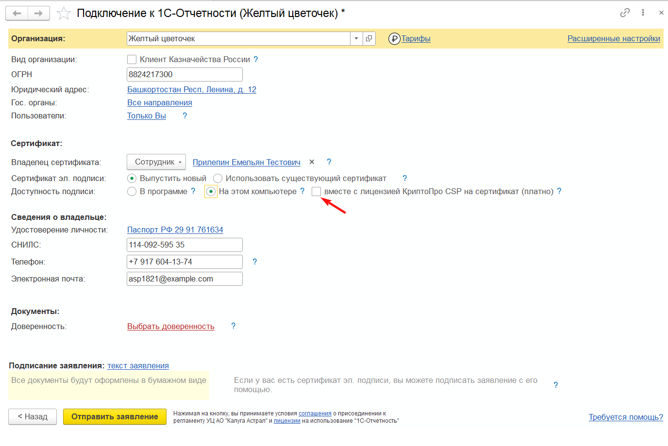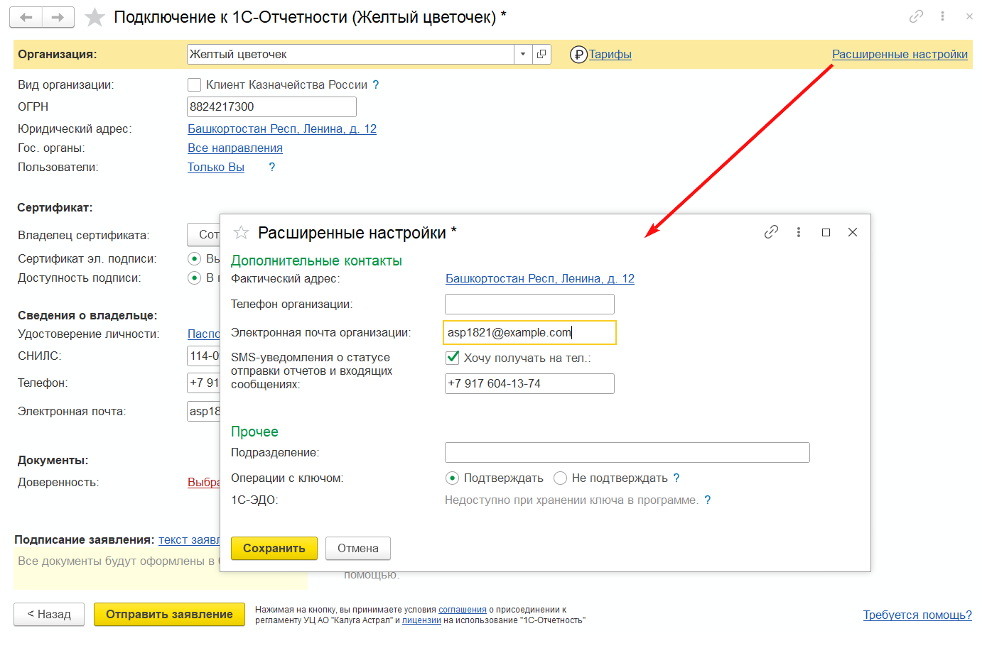 Если сервис подключает руководитель или ИП, то данные об организации и владельце заполнятся автоматически данными из сертификата электронной подписи.