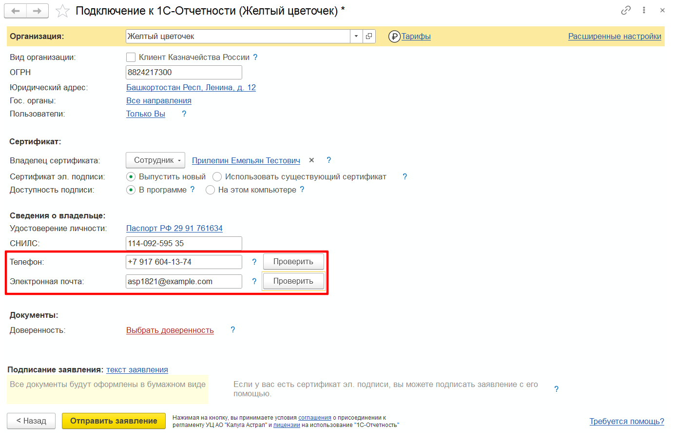 Введите данные в полях Телефон и Электронная почта, затем последовательно нажмите кнопки Проверить (рис.22). Кнопки Проверить доступны только при работе в сервисе "1С:Предприятие 8 через Интернет" (1cfresh.com).
