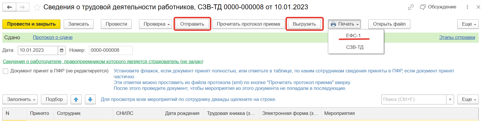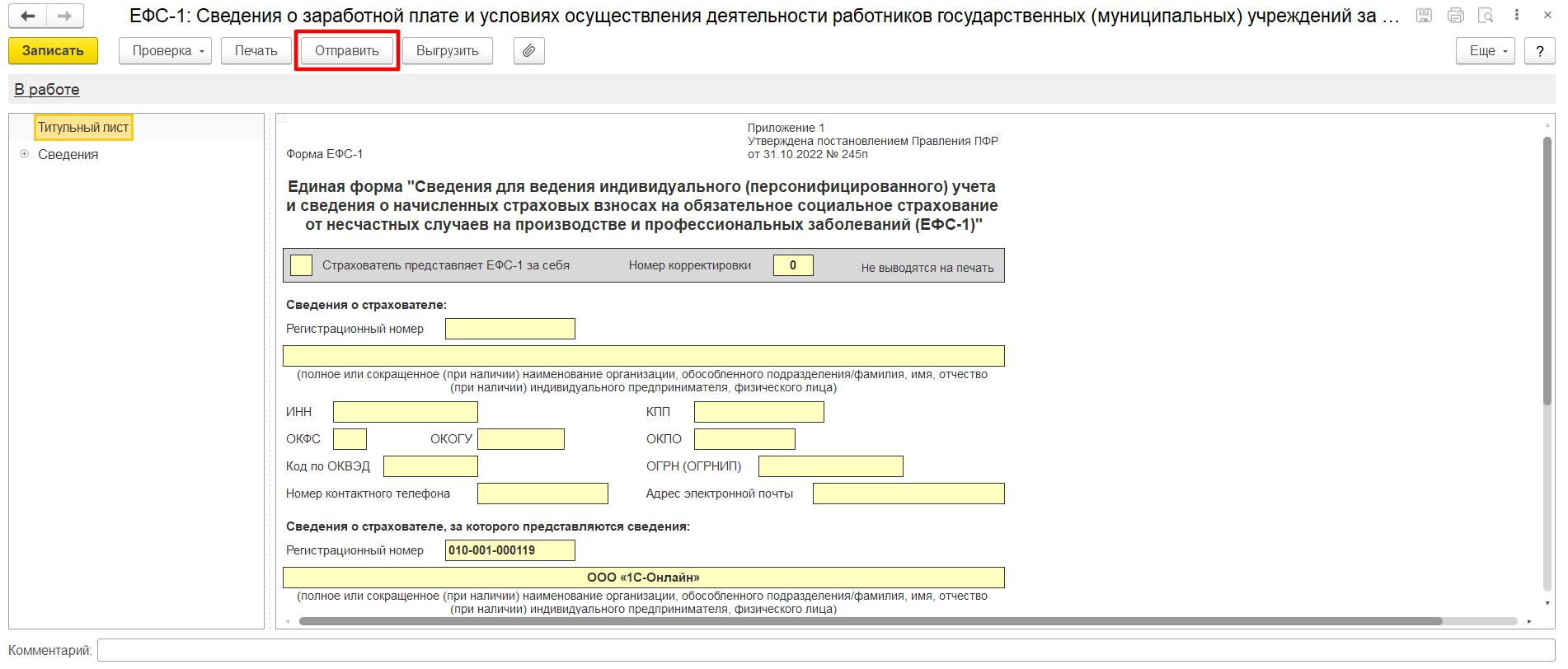 Отправка формы ЕФС-1 в СФР производится нажатием кнопки Отправить из формы документа (рис. 1) Для выгрузки и печати формы ЕФС-1 используйте соответствующие кнопки Выгрузить и Печать на панели отчета (рис.1).