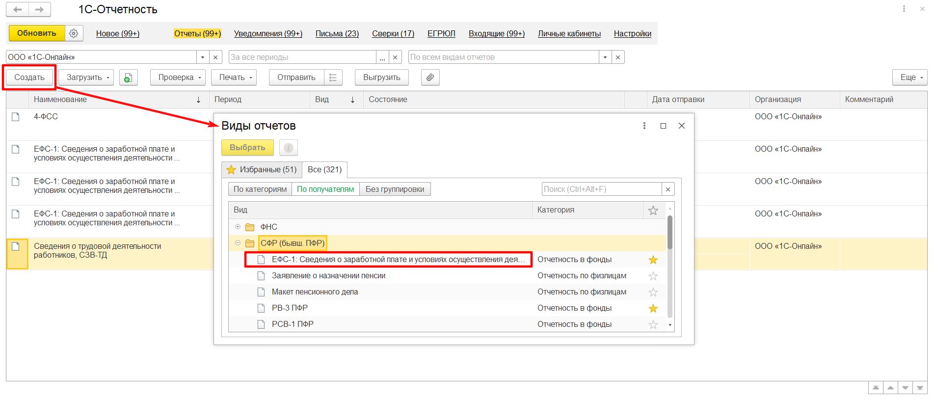 Перед отправкой отчета отправьте Заявление на подключение страхователя к ЭДО СФР (бывш. ПФР) на закладке Уведомления сервиса 1С-Отчетность и дождитесь его регистрации. Заявление необходимо отправить также в том случае, если ранее отправка отчетов происходила через другого оператора.