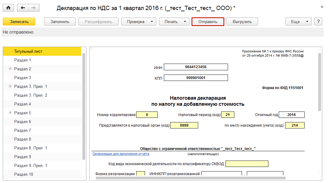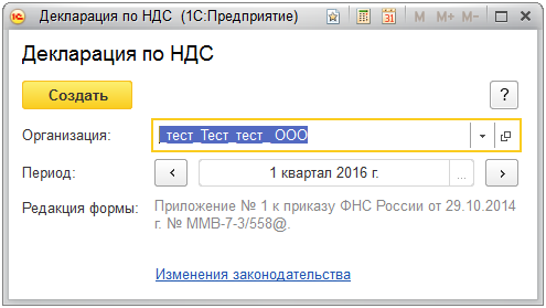 Укажите организацию и период, за который необходимо сформировать декларацию, и нажмите кнопку «Создать»: