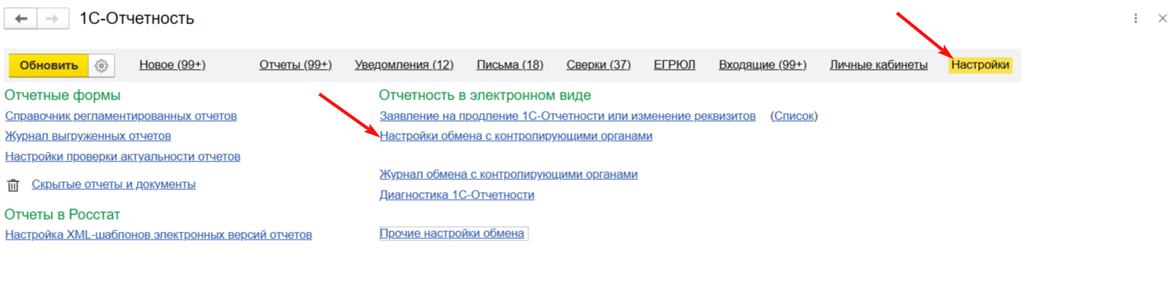 Для подключения к сервису «Мой экспорт» перейдите по гиперссылке Настройки обмена с контролирующими органами на закладке Настройки формы 1С-Отчетности (рис.1).
