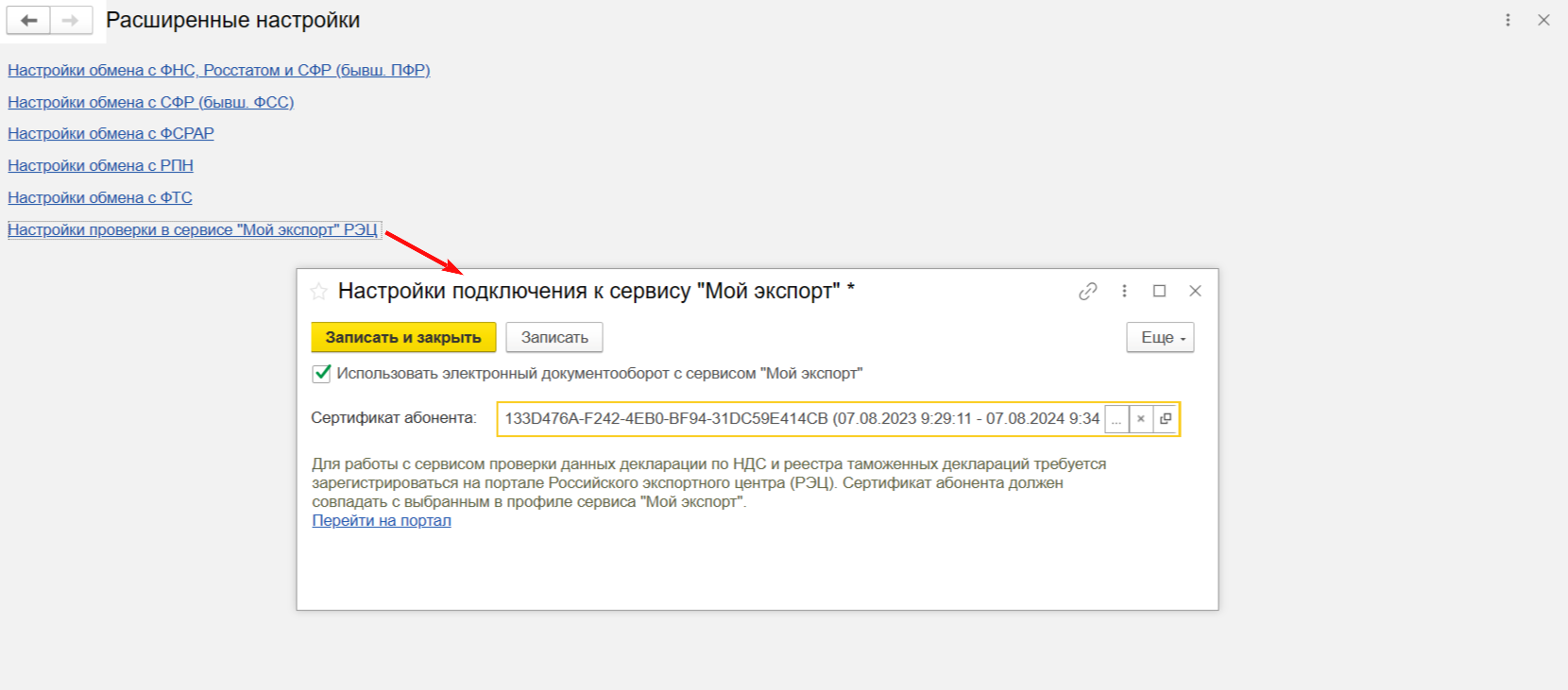 В расширенных настройках перейдите по гиперссылке Настройки проверки в сервисе «Мой экспорт» РЭЦ (рис.2). В открывшейся форме настройки подключения поставьте флажок об использовании электронного документооборота с сервисом «Мой экспорт» и выберите сертификат абонента. Сертификат абонента должен совпадать с выбранным в профиле сервиса «Мой экспорт». Если регистрация в сервисе «Мой экспорт» еще не выполнялась, перейти на портал РЭЦ можно по гиперссылке Перейти на портал.