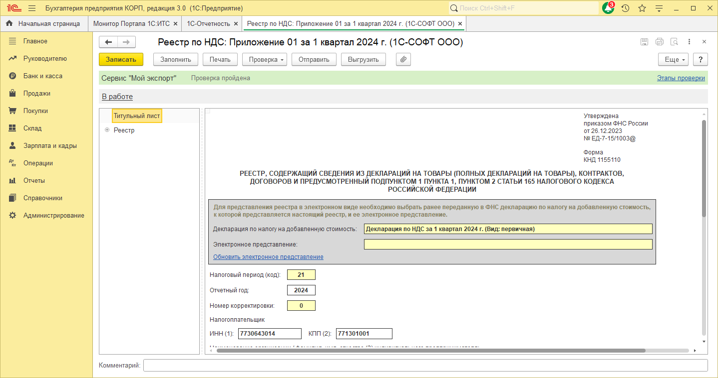 После прохождения проверки в РЭЦ декларацию по НДС и реестр таможенных деклараций можно отправить в ФНС через сервис 1С-Отчетность в обычном порядке.