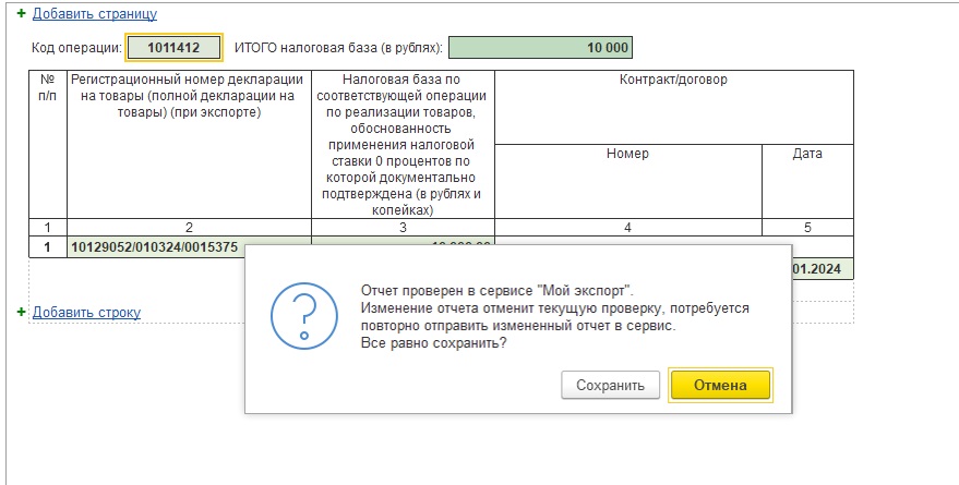 Если после проверки в РЭЦ в декларации будут внесены изменения, то при сохранении в программе отобразится уведомление о необходимости повторной отправки измененного отчета в сервис «Мой экспорт» (рис.9).