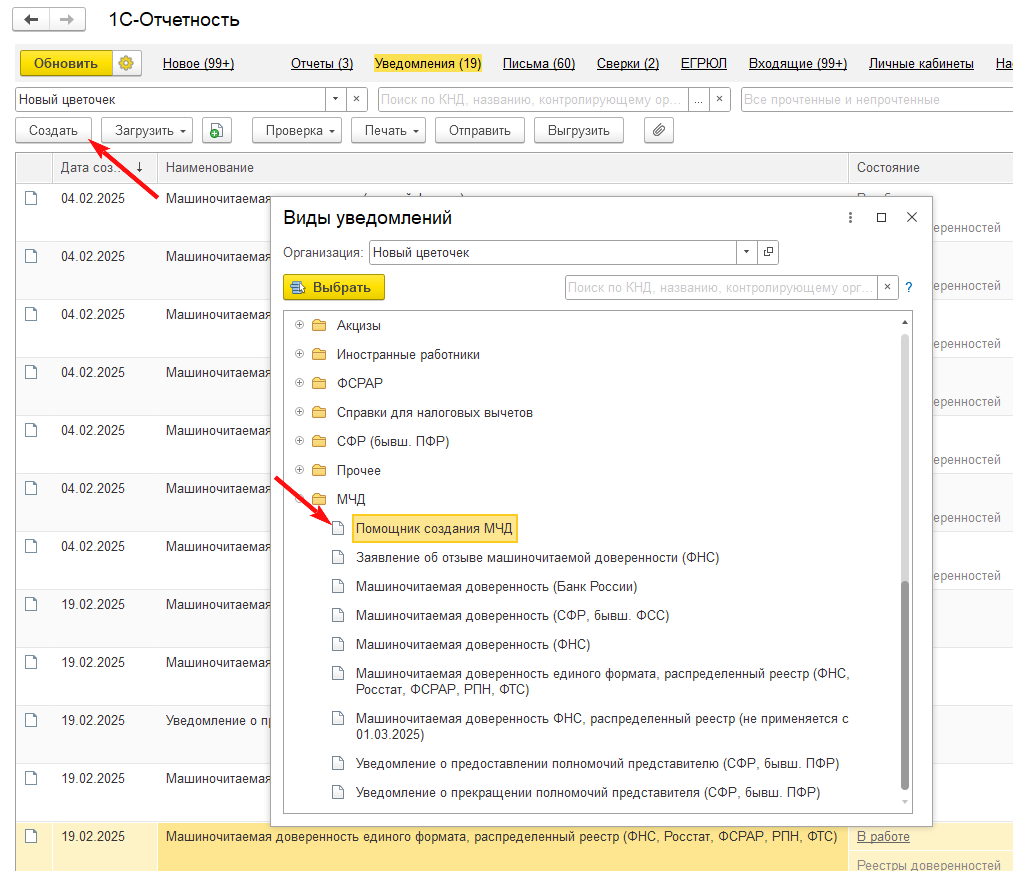 Открыть помощник можно в разделе Уведомления сервиса 1С-Отчетность по кнопке Создать (рис. 1).