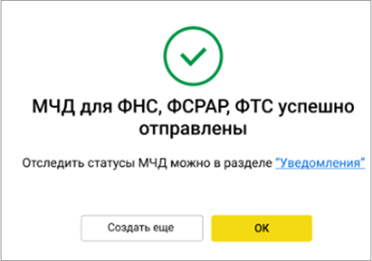 После отправки в программе появится надпись о том, что МЧД успешно отправлены (рис. 10). Отслеживать статусы регистраций МЧД можно в разделе Уведомления. Отправка отчетности по МЧД станет доступной после одобрения заявления на подключение к 1С-Отчетности, если она еще не подключена, и регистрации МЧД.