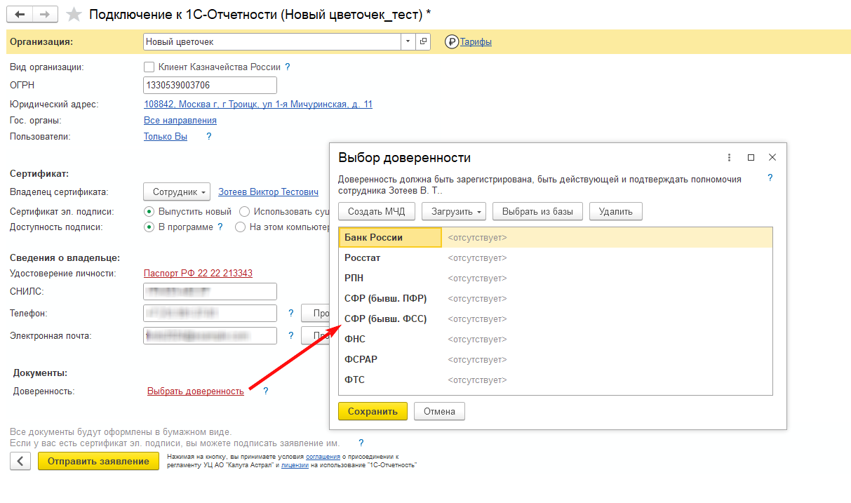 Также открыть помощник можно из заявления на подключение к 1С-Отчетности (рис. 2) и изменение настроек подключения к 1С-Отчетности в строке Доверенность по кнопке Создать МЧД.