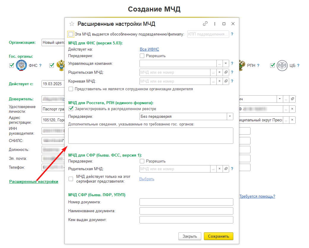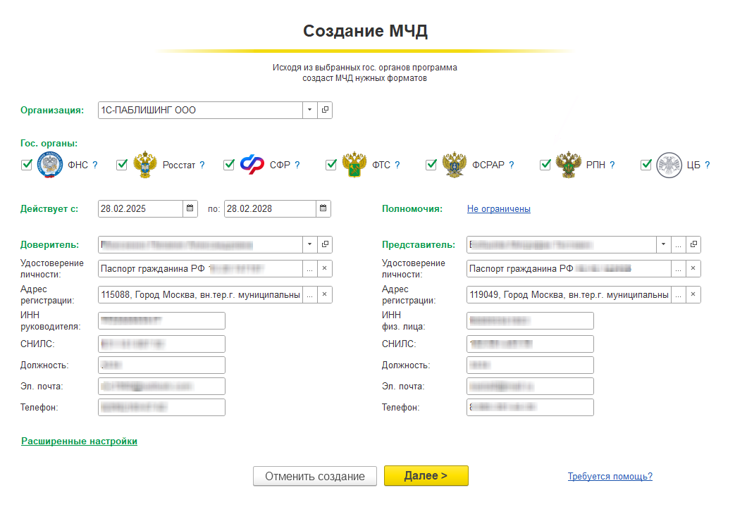 В форме помощника заполните все необходимые данные: срок действия МЧД, данные о доверителе и представителе. По гиперссылке Расширенные настройки при необходимости вы можете указать более детальные настройки МЧД для каждого госоргана (рис. 5).