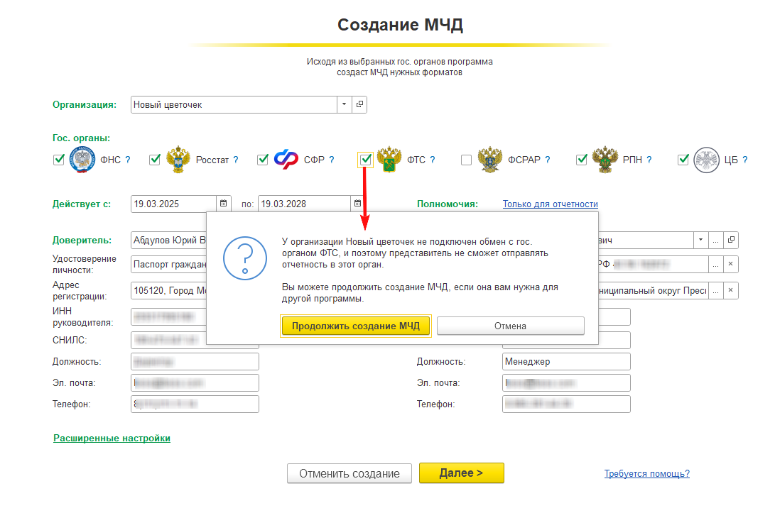 Если вы отметите госорган, с которым в программе не подключен обмен, программа сообщит об этом (рис. 4). Если вы планируете подключить обмен с госорганом позже или вам нужна МЧД для другой программы и подключать обмен в текущей программе не планируется, нажмите Продолжить создание МЧД. В таком случае вы сможете продолжить создание МЧД, в том числе и для госоргана, с которым не настроен обмен.
