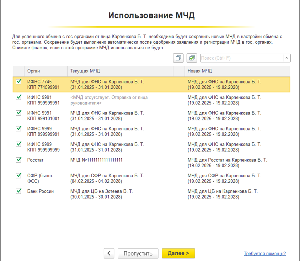 После заполнения всех данных в помощнике нажмите кнопку Далее. При этом, если у указанного представителя уже есть учетная запись в 1С-Отчетности, откроется следующий шаг помощника – добавление созданных МЧД в настройки обмена с госорганами (рис. 6). Добавление МЧД в настройки обмена с госорганами будет выполнено после регистрации МЧД в госорганах или, если 1С-Отчетность еще не подключена, то после одобрения заявления на подключение 1С-Отчетности и регистрации МЧД в госорганах. Вы можете снять флажки по тем госорганам, по которым не планируете использовать созданную МЧД в текущей программе. Если в настройках обмена с госорганами уже указана МЧД, то на текущем шаге вы можете заменить ее на созданную.