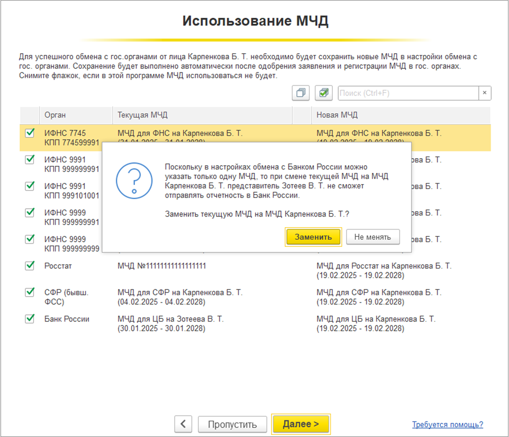 В связи с особенностями обмена с Банком России в настройках обмена можно указать только одну МЧД. Поэтому в случае, если в настройках обмена была указана МЧД на другого пользователя, программа уведомит об этом и необходимо будет подтверждение, чтобы заменить МЧД другого представителя на созданную МЧД (рис. 7).