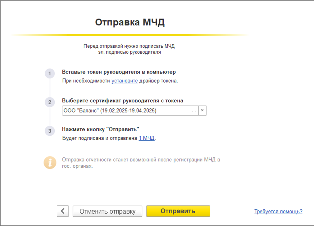 После указания данных для сохранения МЧД в настройках обмена с госорганами нажмите кнопку Далее для подписания и отправки МЧД на регистрацию. На следующем шаге вставьте токен руководителя в компьютер, выберите сертификат для подписания МЧД и нажмите кнопку Отправить (рис. 8).