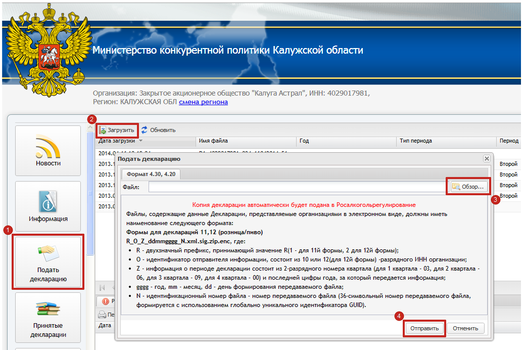 Отправка деклараций в Росалкогольрегулирование автоматизирована для всех регионов. Для отправки деклараций организация должна быть зарегистрирована на портале Росалкогольрегулирования.