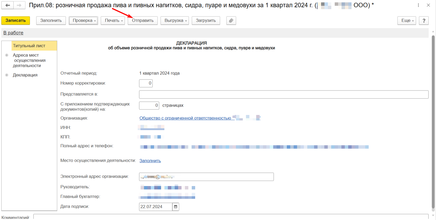 После заполнения декларации отправьте отчетность, нажав кнопку «Отправить». Также перед отправкой вы можете проверить отчет, использую команду «Проверка - Проверить в интернете». В ходе такой проверки файлы отчетности в зашифрованном виде передаются на специальный сервер в Интернете, где выполняется их форматно-логический контроль и, в некоторых случаях, проверка контрольных соотношений.
