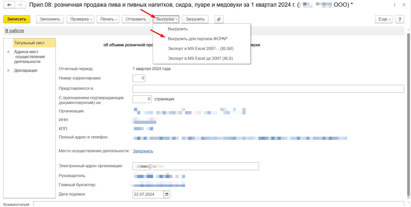 Если Вам необходимо предоставить декларацию через единый портал Росалкогольрегулирования, выгрузите ее из ПО 1С. Для этого в форме отчетности выберите пункт «Выгрузка» → «Выгрузить для портала ФСРАР»: