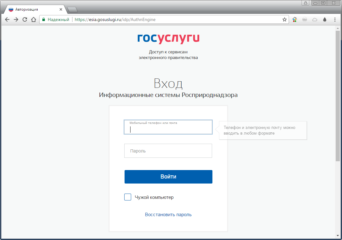 При входе на портал Росприроднадзора необходимо указать свои регистрационные данные (рис. 2).