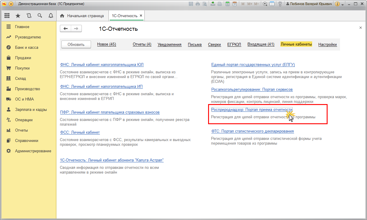 Перейти на портал Росприроднадзора можно из формы "1С-Отчетность" (меню "Личные кабинеты") (рис. 5). По ссылке "Росприроднадзор: Портал приема отчетности" открывается указанный портал.