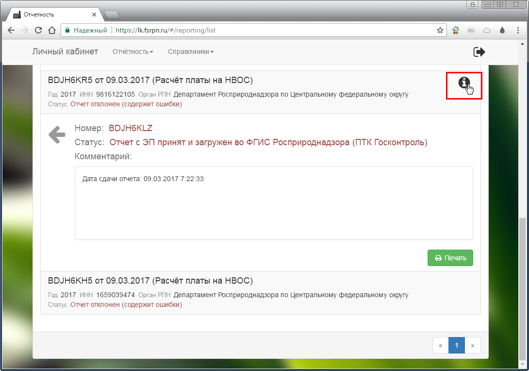 Для отслеживания статусов отправки отчетов на портале Росприроднадзора используйте кнопку со знаком "i" (рис. 8).