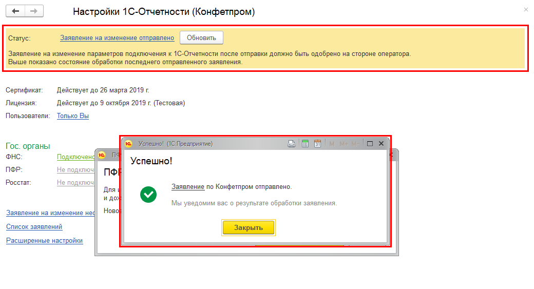 Когда заявление будет отправлено, появится сообщение об успешной отправке. Одновременно в форме настроек появляется информация об отправленном заявлении и статусе его рассмотрения (рис. 3). Для обновления статуса заявления нажимайте кнопку "Обновить" или ожидайте – программа сама оповестит о том, что заявление одобрено, затем порекомендует выполнить соответствующие настройки (см. рис. 4).
