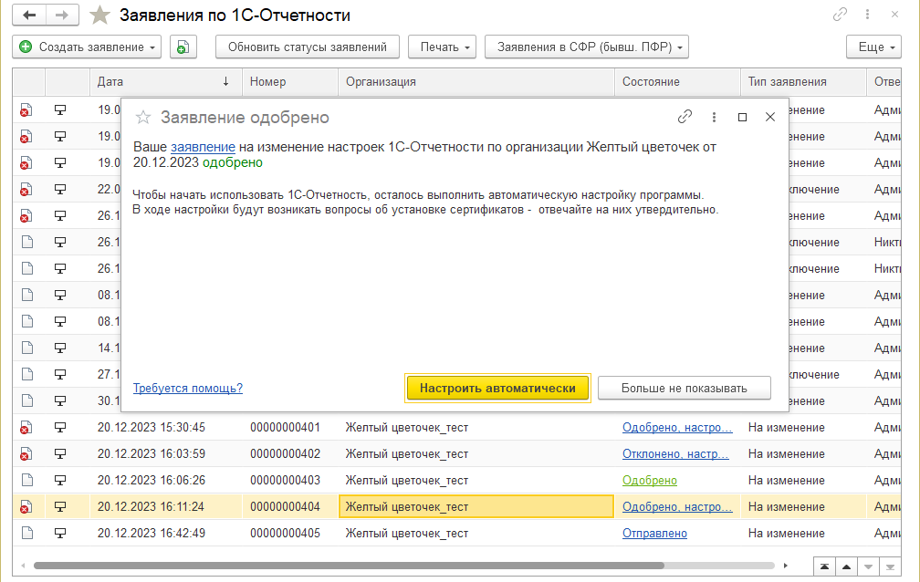 Для обновления статуса заявления нажимайте кнопку "Обновить" или ожидайте – программа сама оповестит о том, что заявление одобрено, и порекомендует выполнить соответствующие настройки (см. рис. 4).