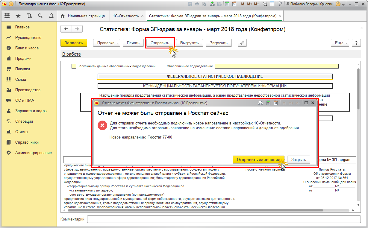 Если не выполнить подключение гос. органа и попытаться отправить отчет, то появится сообщение о том, что отправка невозможна, т.к. направление не подключено (рис. 12).