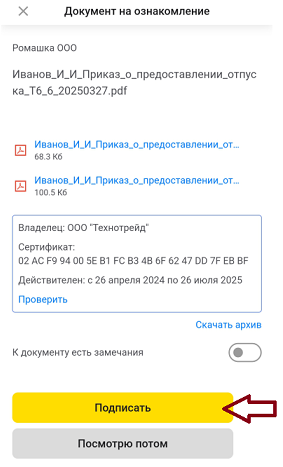После выполнения настройки при нажатии кнопки «Подписать» на документе, который прислали на подпись, как показано на картинке ниже.