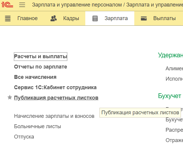 После начисления заработной платы сотрудникам в программе перейдите в раздел «Зарплата» – «Публикация расчетных листков».