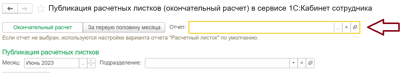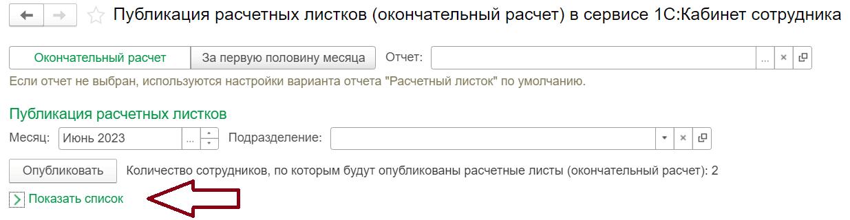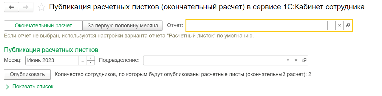 Перед публикацией необходимо выбрать, за какой период выдаются расчетные листки – за первую половину месяца или производится окончательный расчет (по умолчанию стоит значение «окончательный расчет»).