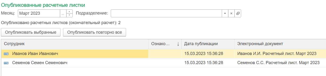 После публикации расчетных листков в разделе «Опубликованные расчетные листки» сформируется журнал выдачи расчетных листков с отметками ознакомления.