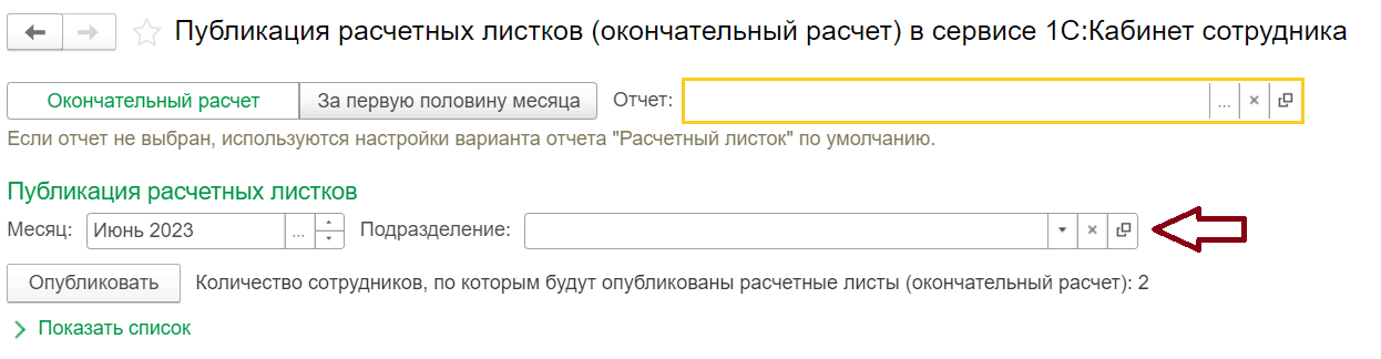 Выбор подразделения, по которому будут опубликованы расчетные листки.