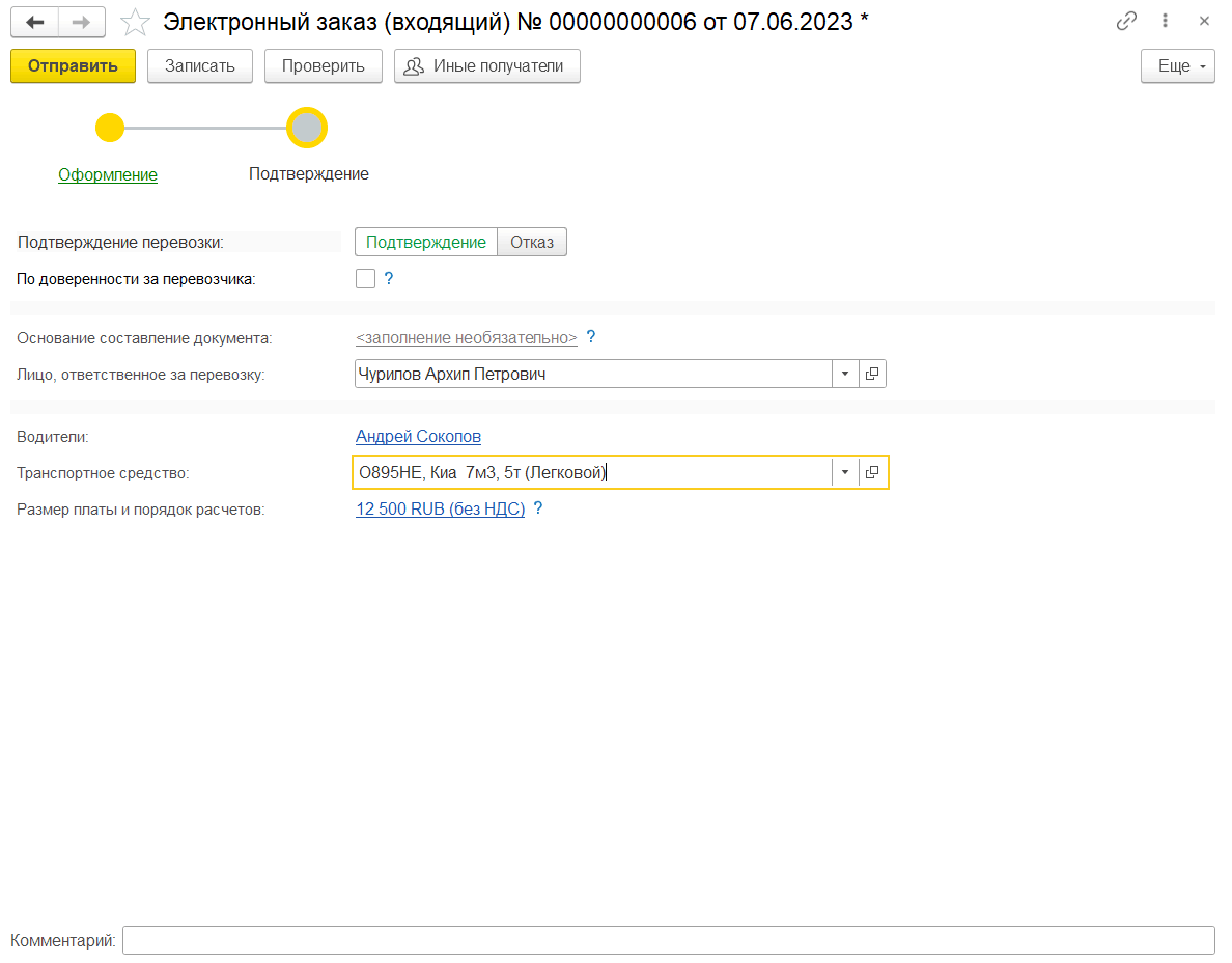 Перевозчик после получения заказа (заявки) подтверждает свое согласие с условиями перевозки или отказывается от нее с указанием причин. При подтверждении перевозки ответственный сотрудник вносит информацию о водителе, транспортном средстве и размере платы за перевозку (информация перевозчика) (рис.2).